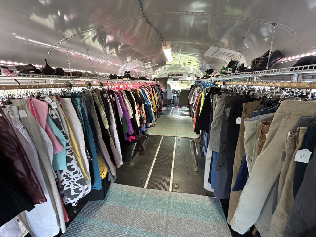 Mobile outreach buses from the Green Thread Project bring clothing, shoes, and hygiene items to the community.